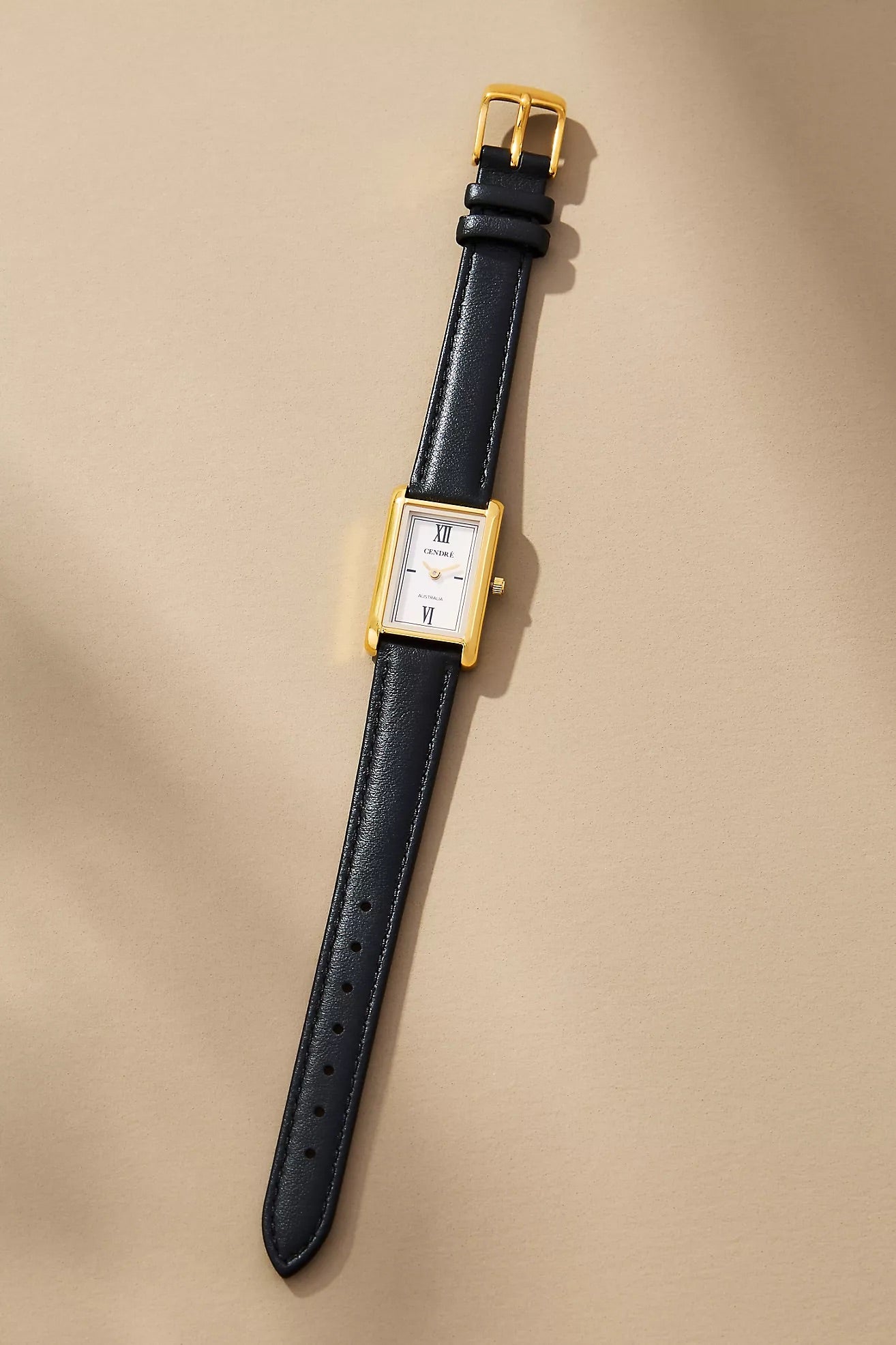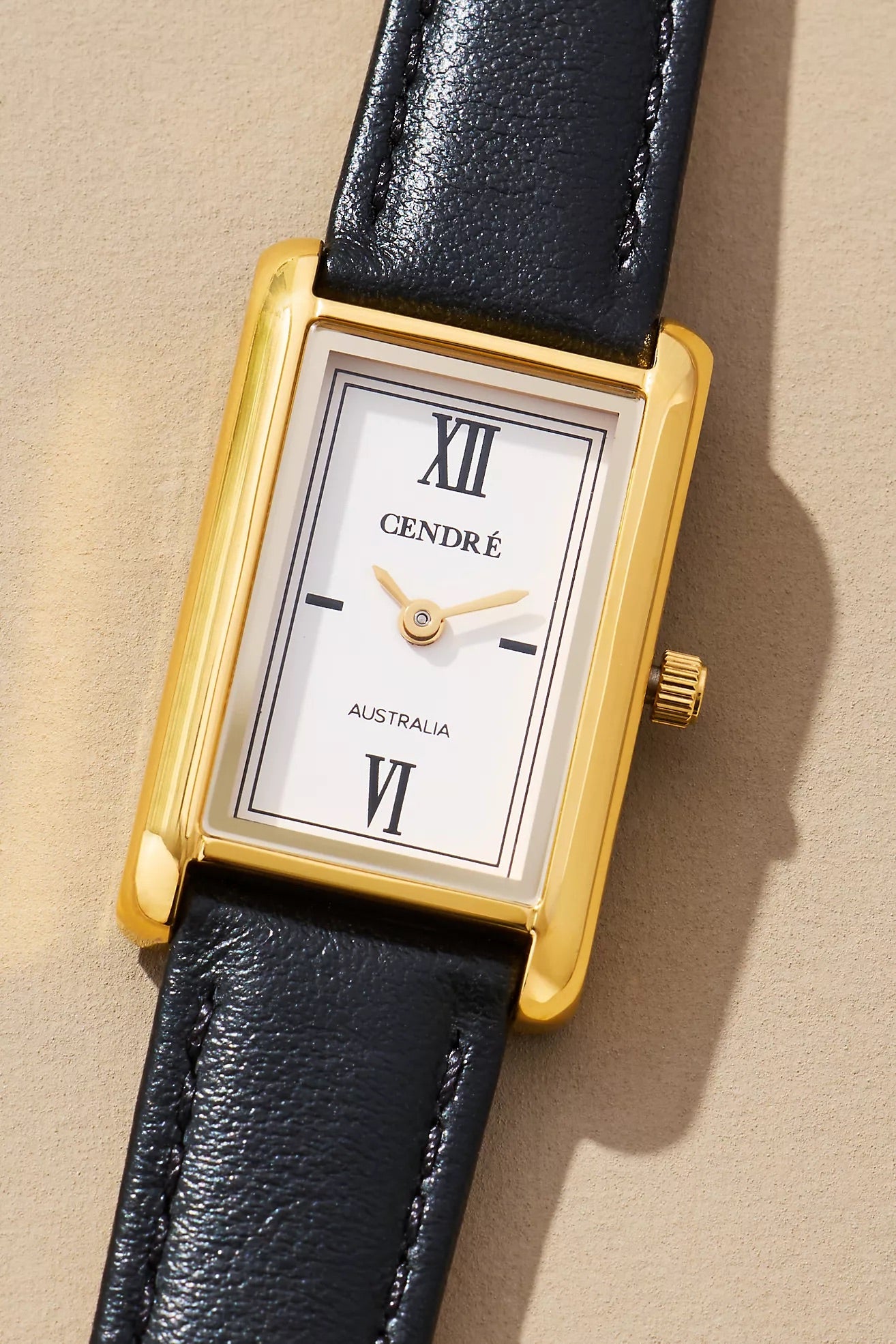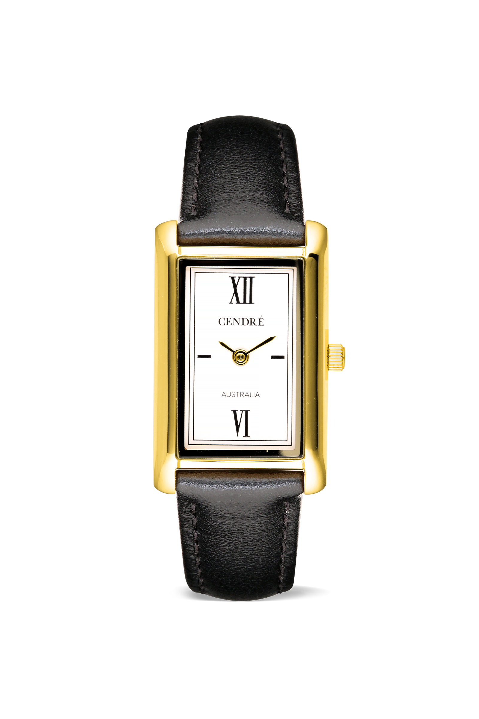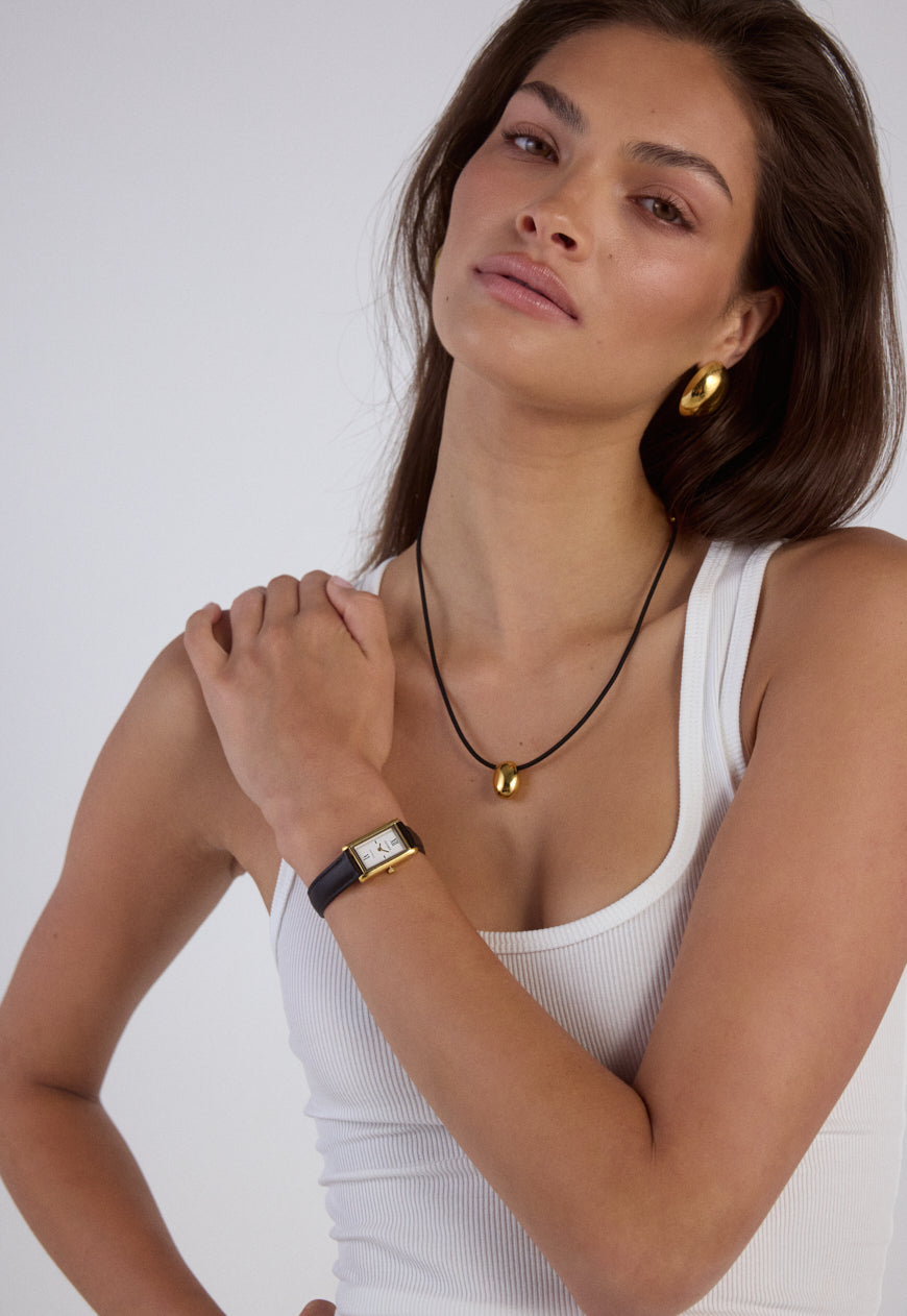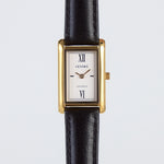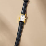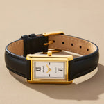 Crafted from 18k premium gold plated stainless steel, featuring a rectangular silhouette and signature roman numeral dial.