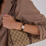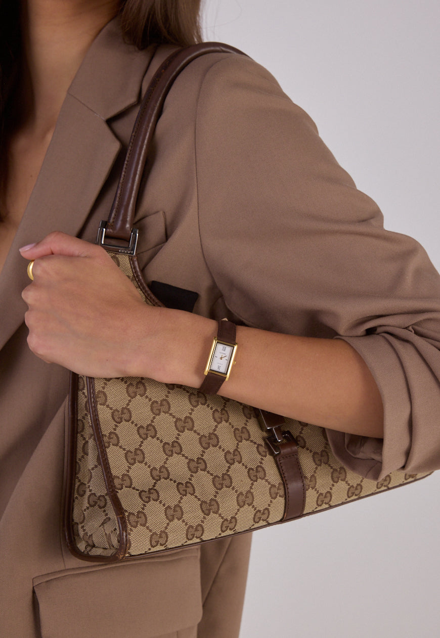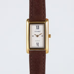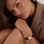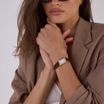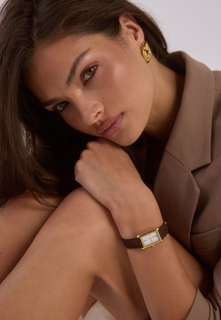 Crafted from 18k premium gold plated stainless steel, featuring a rectangular silhouette and signature roman numeral dial.