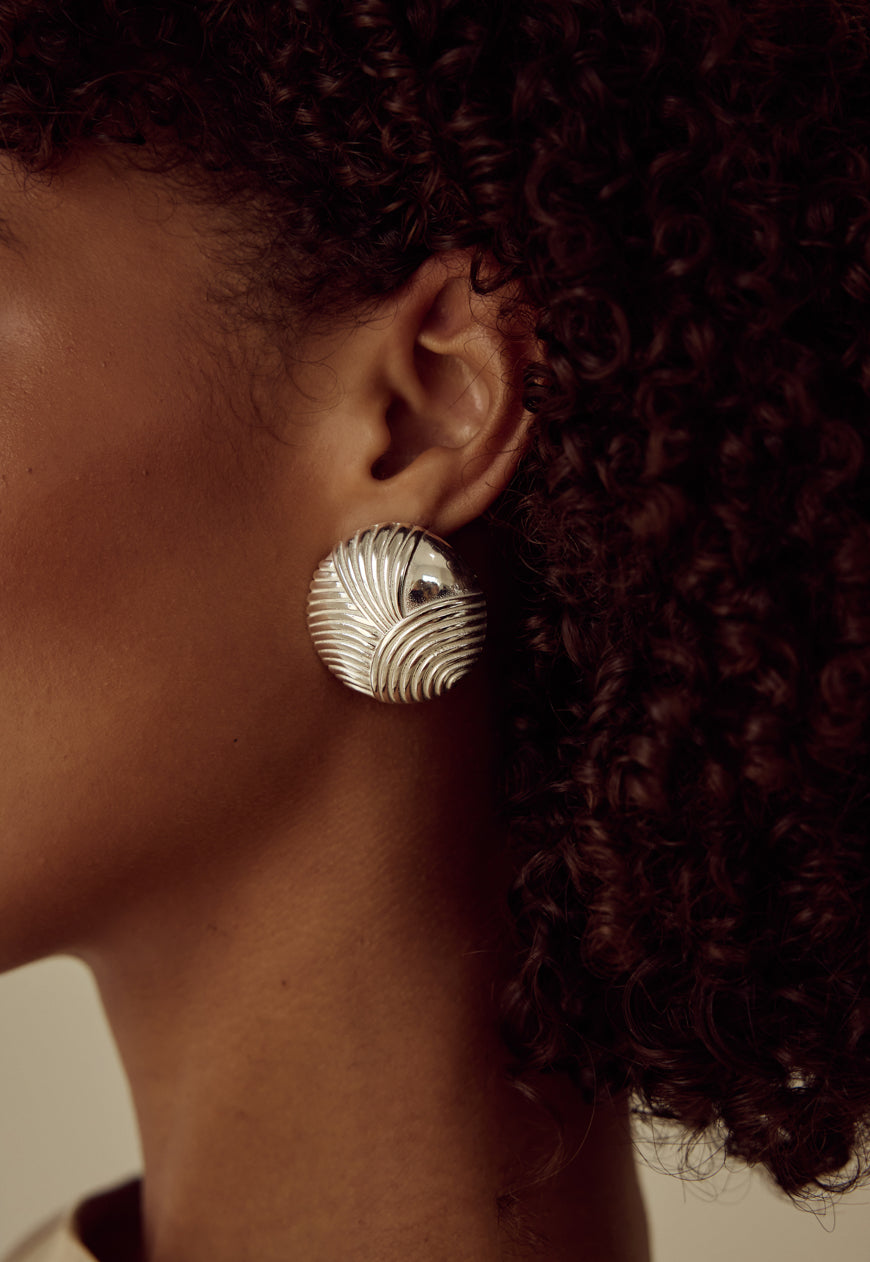 Textured and sculptural, the Bambi Earrings feature an oval-shaped design with curved ribbed lines that wrap across a smooth, domed surface. Crafted from high polish plated stainless steel their dimensional form adds texture to any look.