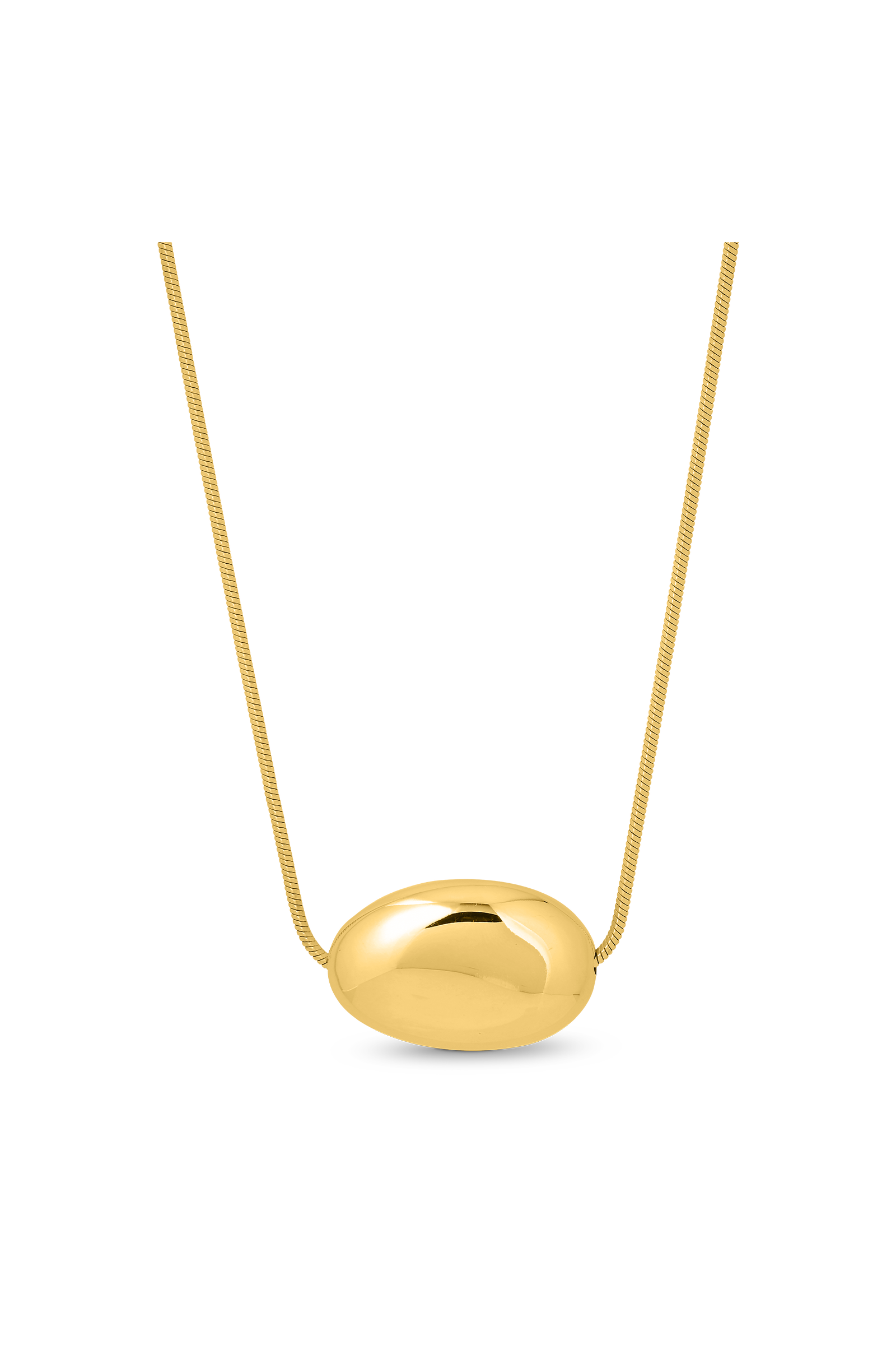 The Sloane Necklace is a rounded, 18k Gold polished pendant strung on a delicate chain. A sculptural piece that transitions seamlessly from day to night.