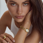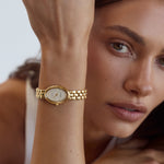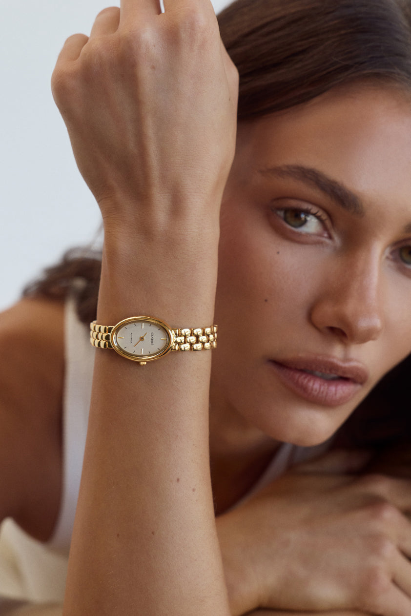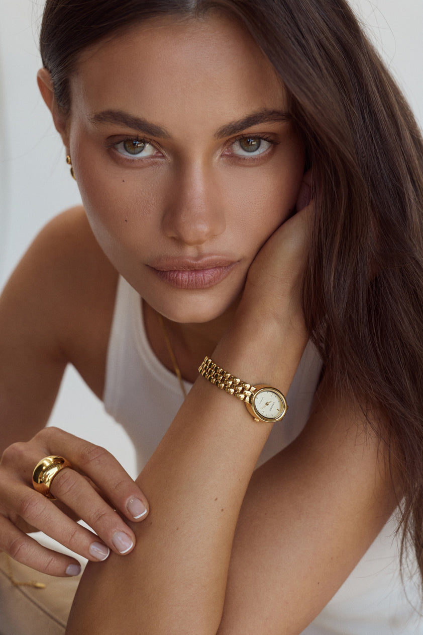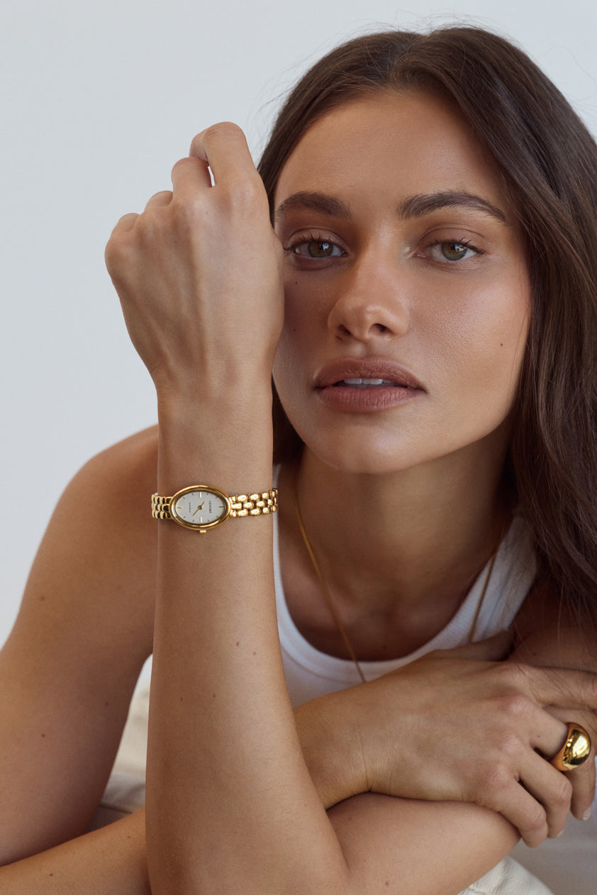 Indulge in our number one best selling Phoebe watch - a staple poised with a feminine silhouette, modern charm & practicality for the everyday. Ready to fit graciously into your adornment rotation, the Phoebe - Gold has been built on 18k Premium double gold plated stainless steel and features a white, oval faced imprinted with our signature brand-mark and adjustable strap to personalise your fit.