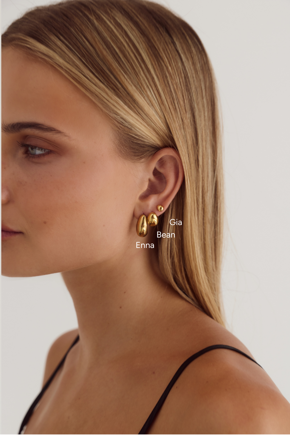 The Bean Earrings feature a smooth bean-like silhouette. Crafted with 18k Premium Gold Plating on Stainless Steel, their petite and delicate form makes them a subtle statement, perfect for everyday wear.