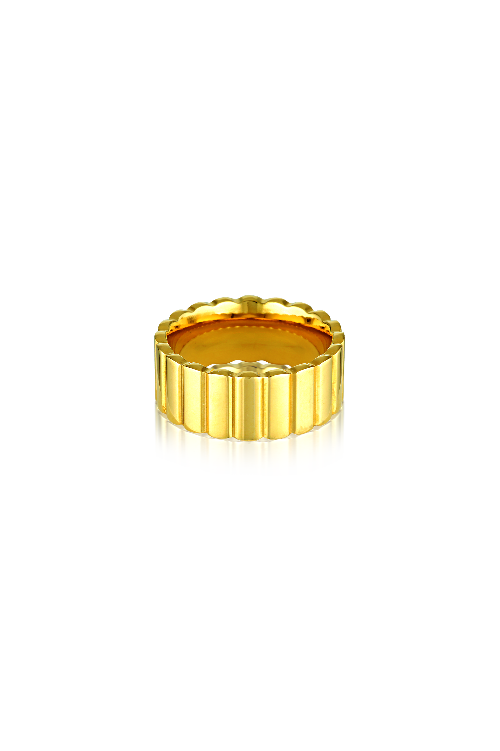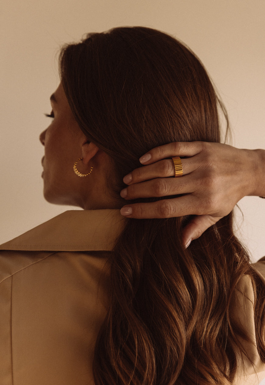 The Amelie Ring features a ridged band with a softly scalloped edge. Crafted in 18k gold plated stainless steel, its bold structure and smooth interior balance strength and femininity.