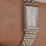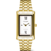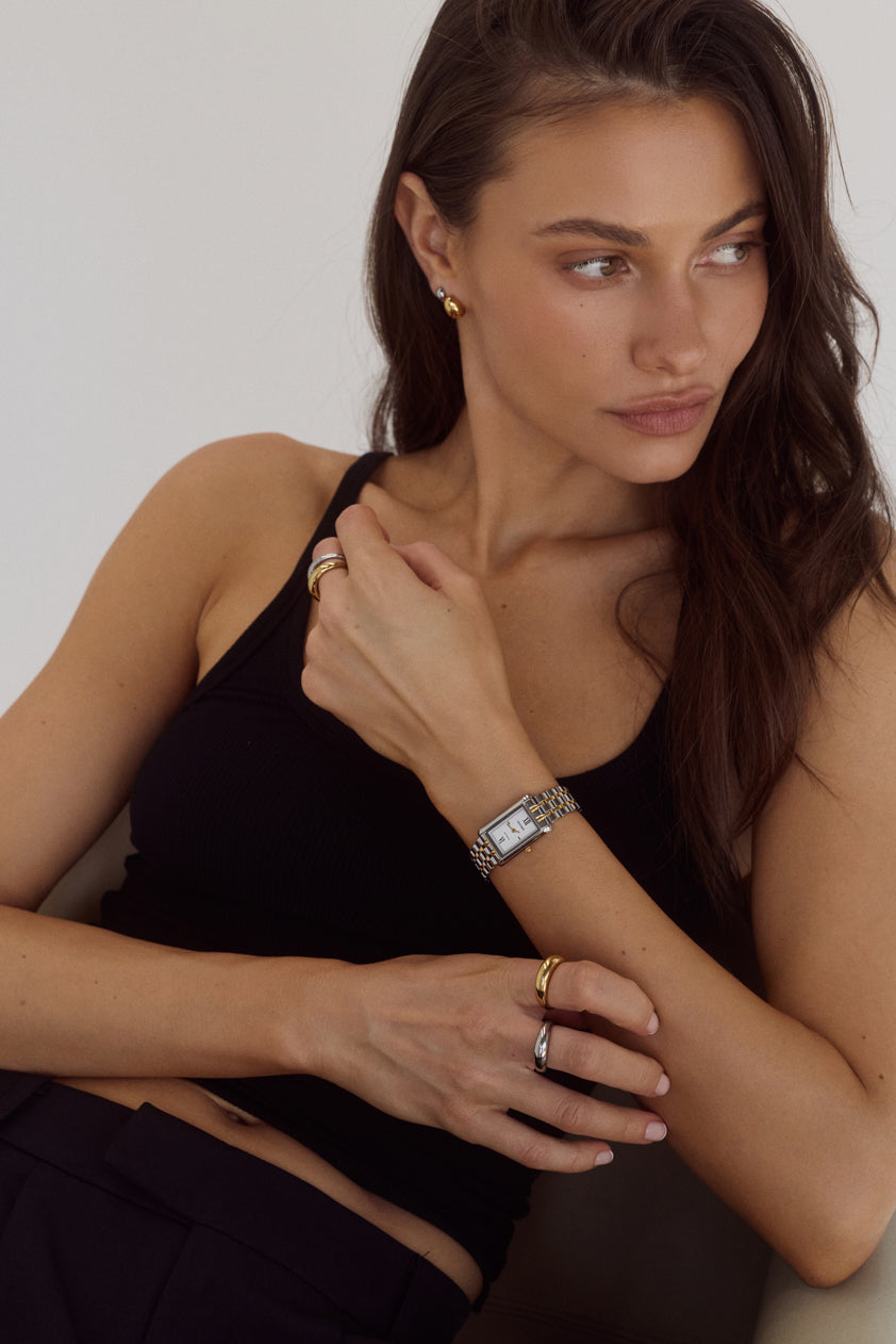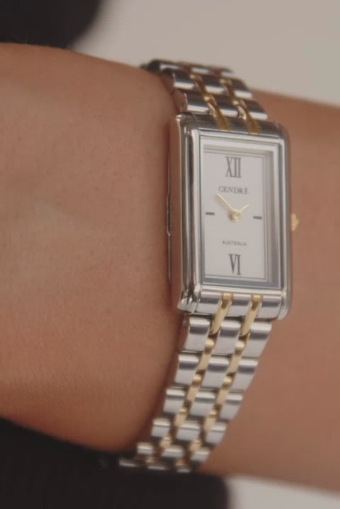 Crafted from 18k premium gold plated stainless steel and polished silver stainless steel, featuring a rectangular silhouette and signature roman numeral dial.