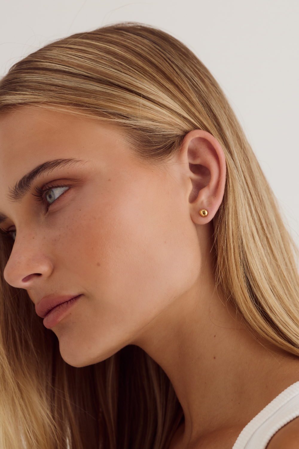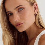 The Gia Earrings feature a rounded, organic curve. Crafted from 18k premium gold-plated stainless steel, their sculptural form sits close to the ear, offering a modern, understated accent that layers effortlessly with other pieces like the Bean Earrings.