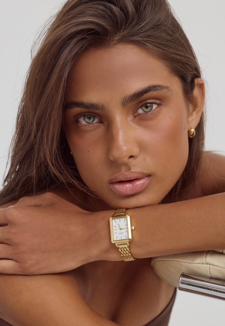 Crafted from 14k premium gold plated stainless steel, featuring a minimalist rectangular white face.