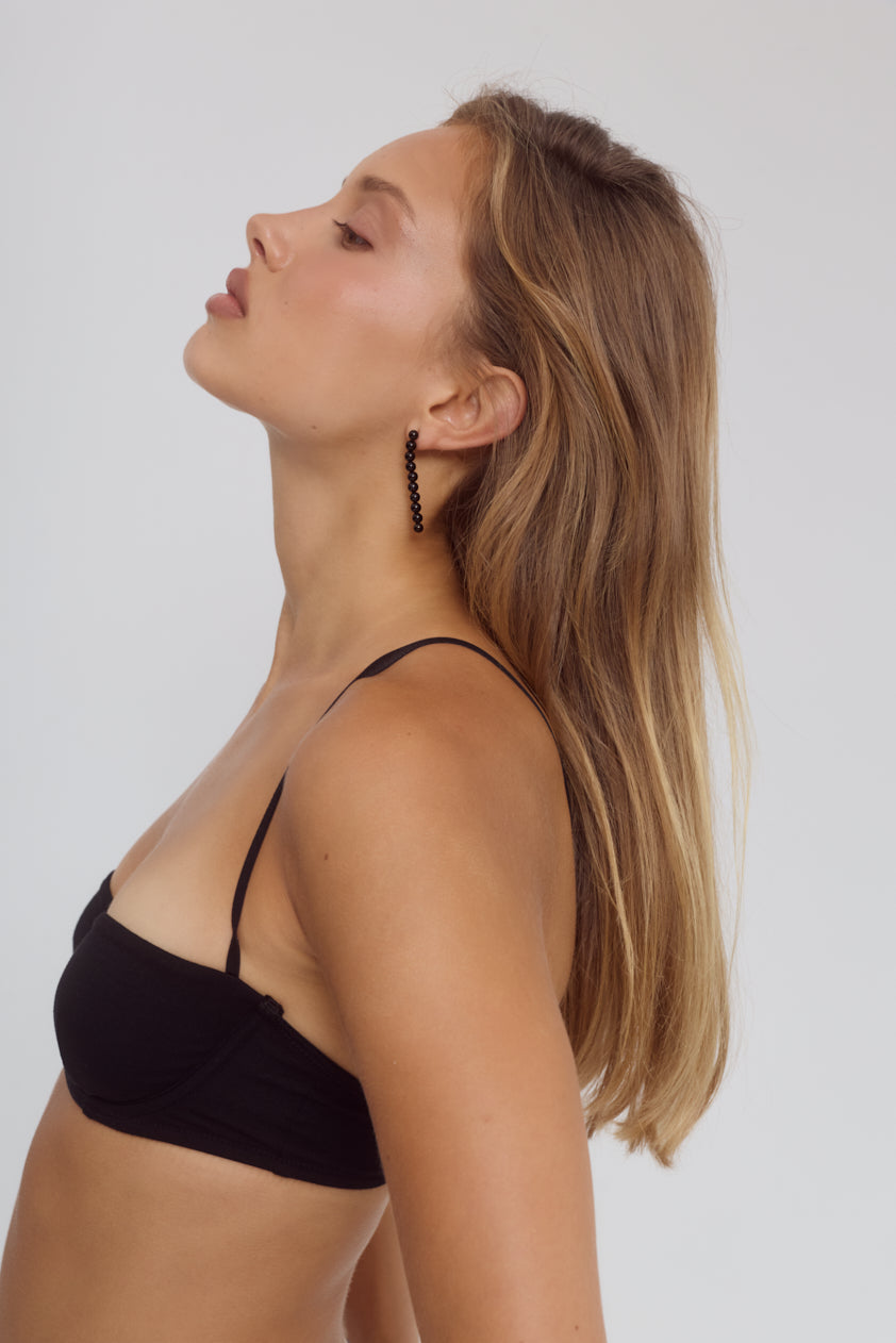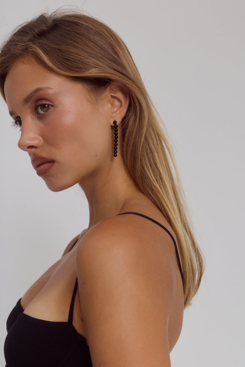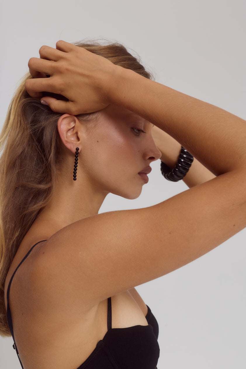 The Primrose Earrings feature a linear drop of glossy black resin beads anchored by a minimalist stud. Their elongated silhouette and high-shine finish bring a refined yet modern edge to everyday styling.