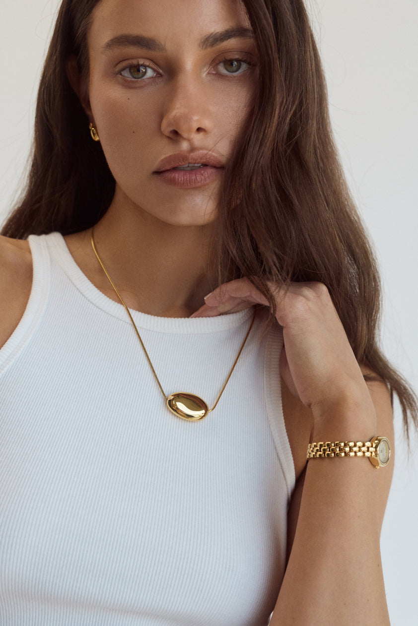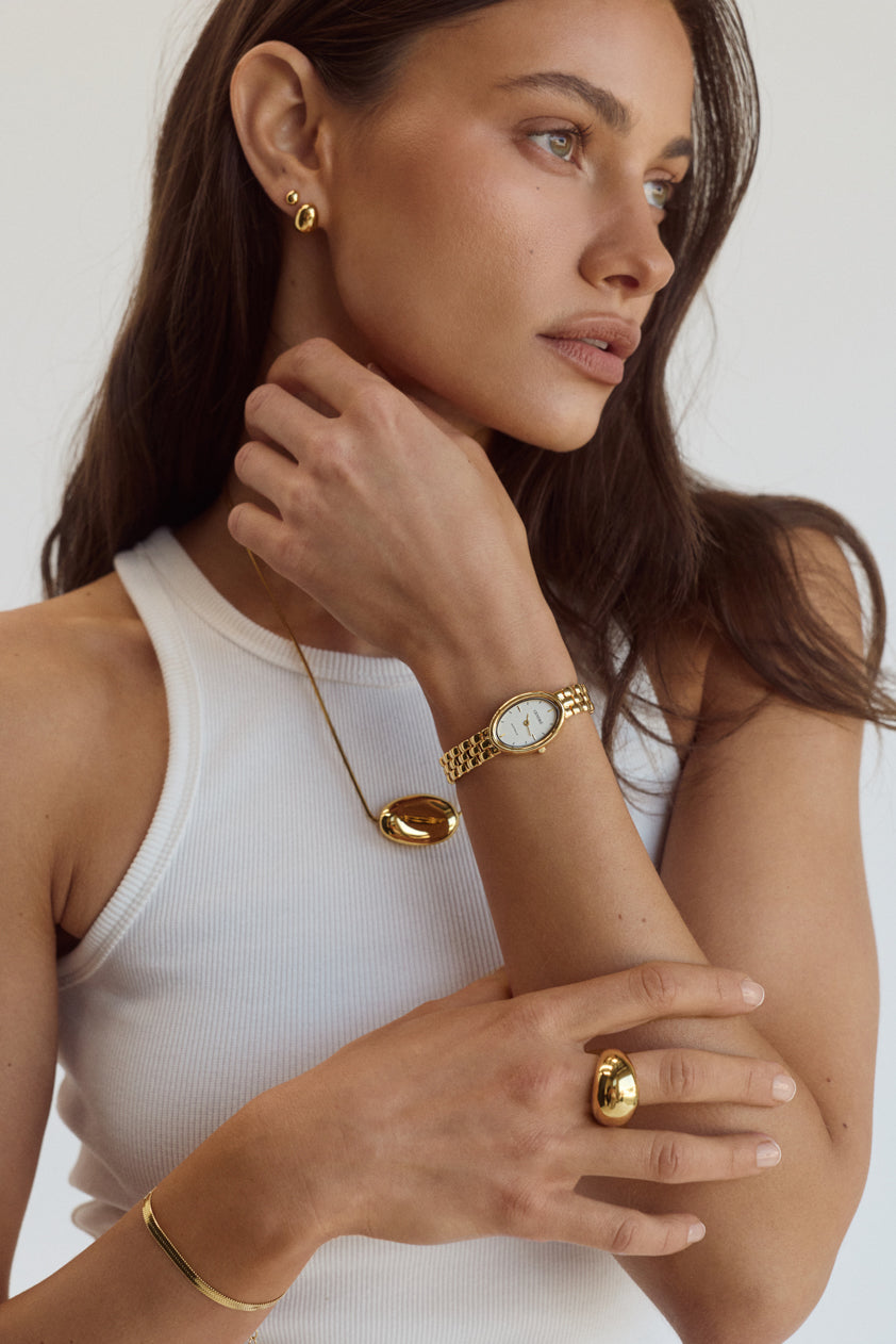 Rich, warm, and softly luminous – our signature gold finish. Designed to make a subtle statement, each piece is plated over high-quality stainless steel for enduring wear.