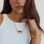The Sloane Belt features a rounded, 18k Gold polished pendant strung on a delicate chain. Designed to be worn at the waist or adjusted into the Sloane Necklace, this versatile piece transitions seamlessly from day to night.