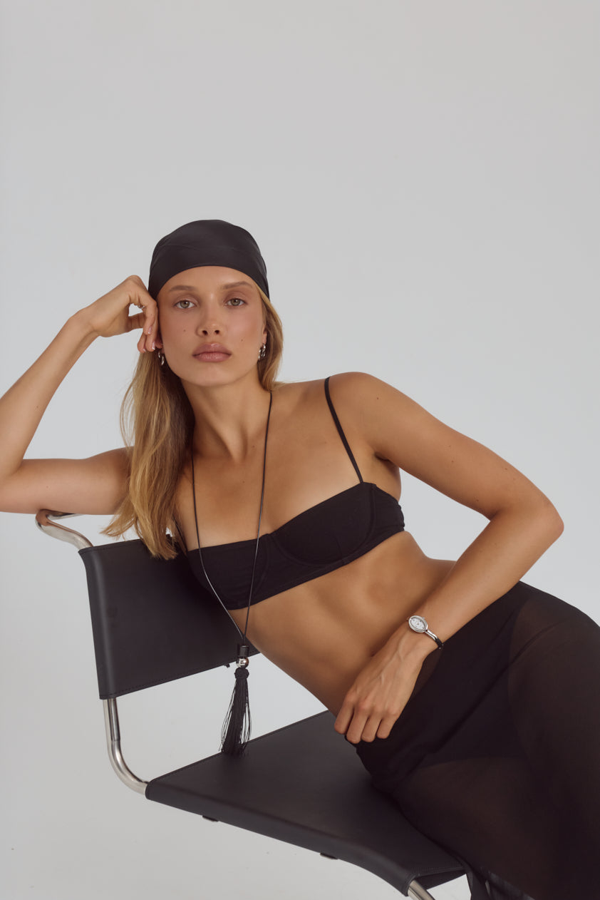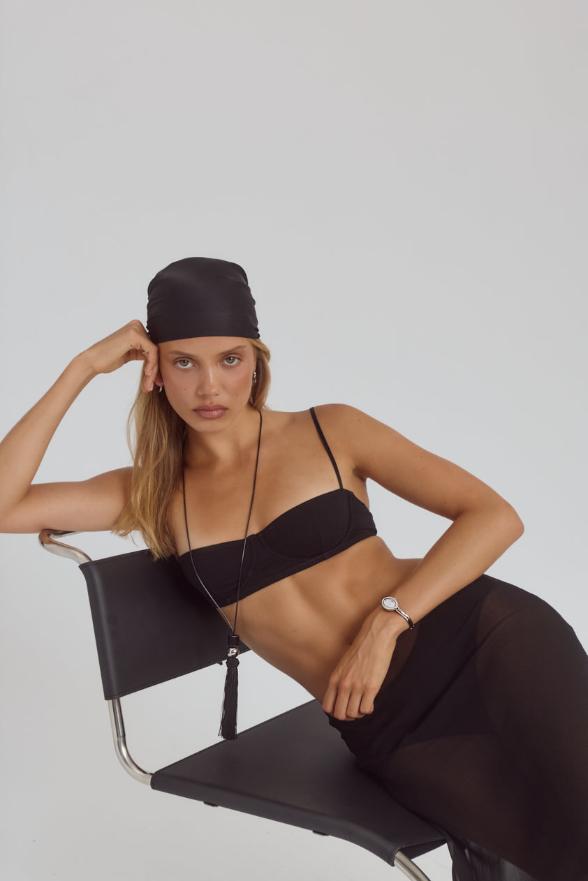 The Winona Necklace features a long black cord finished with a sculptural tassel drop and polished stainless steel sphere pendant. Its fluid silhouette and elongated form create a refined statement with effortless edge.