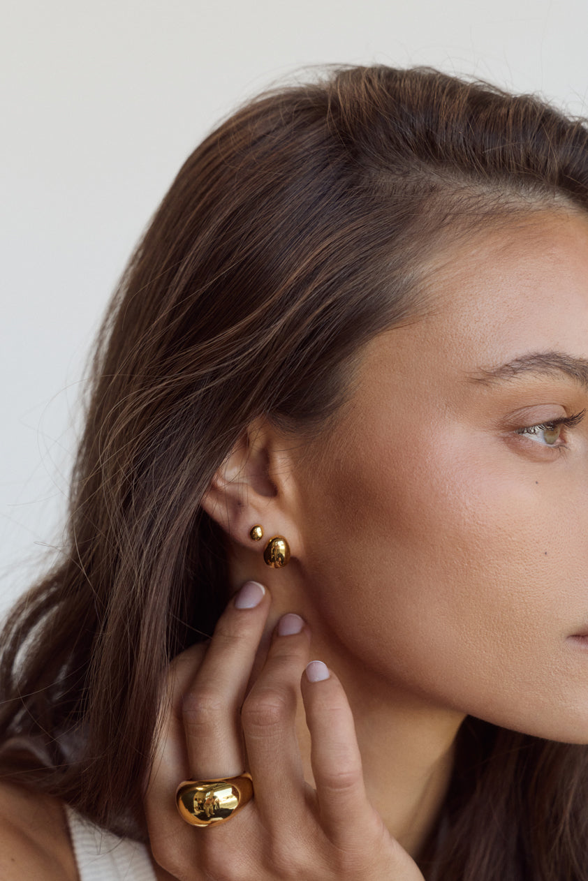 Delicate and distinctive, the Bean Earrings feature a smooth bean-like silhouette. Crafted with 18k Premium Gold Plating on Stainless Steel, their petite form makes them a subtle statement, perfect for everyday wear.