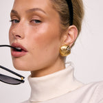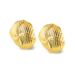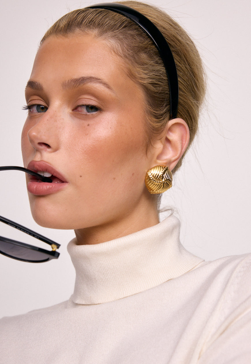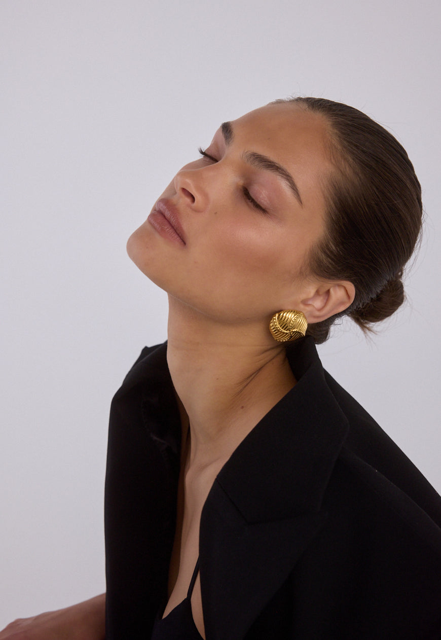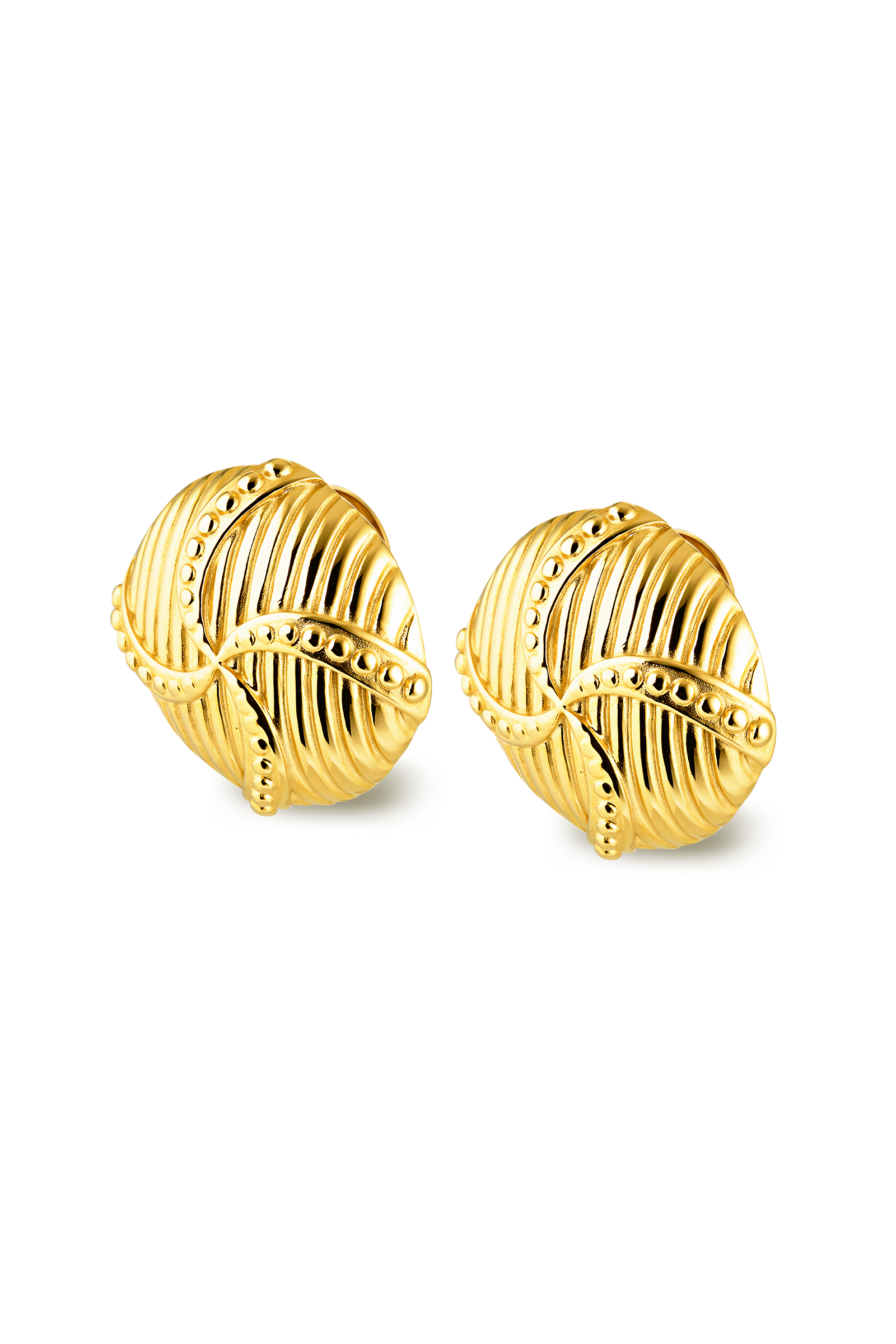 Vintage inspired textured form. The Cindy Earrings feature a rounded, ribbed design with raised beaded lines throughout, crafted in 18K Gold Plated Stainless Steel.