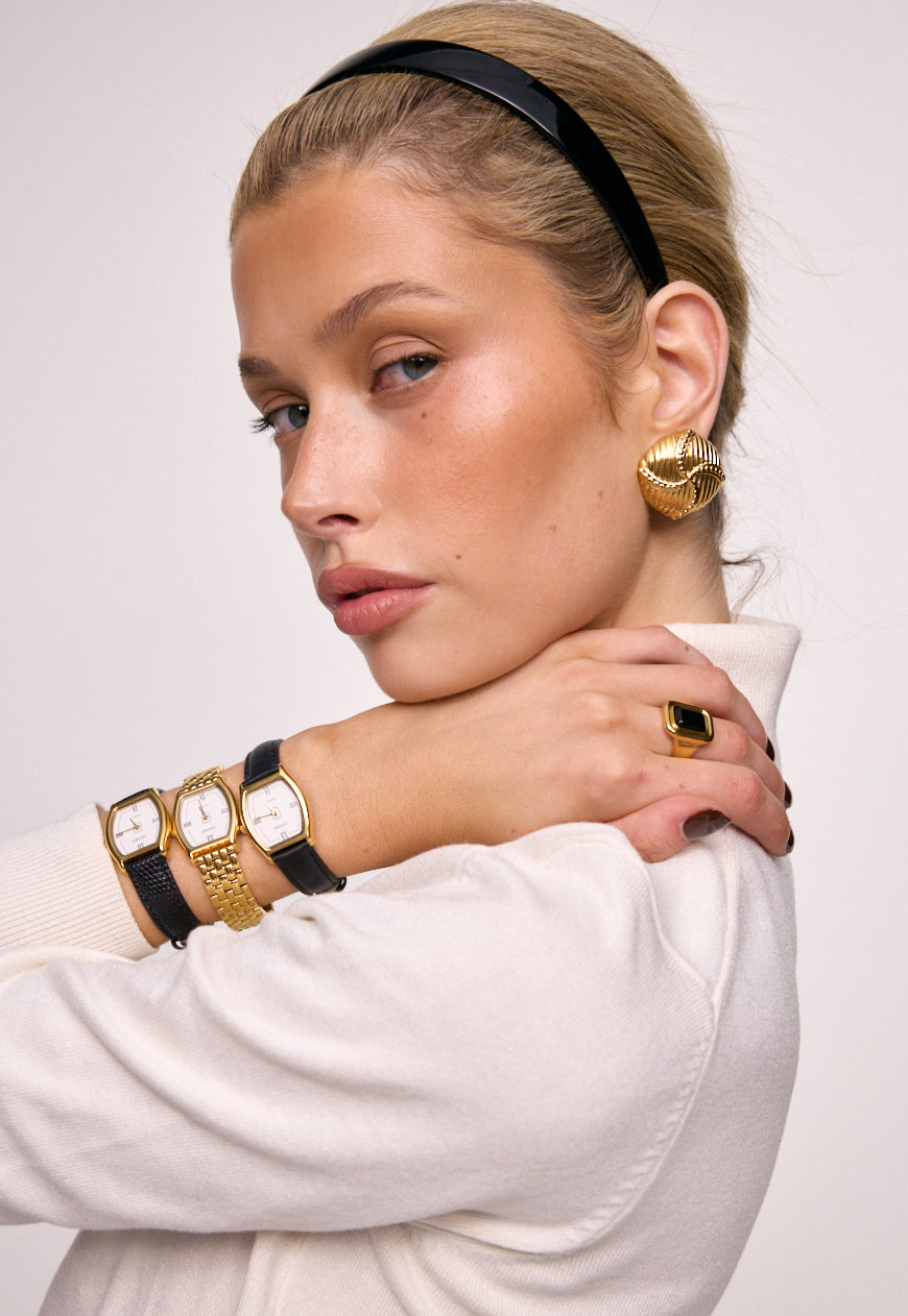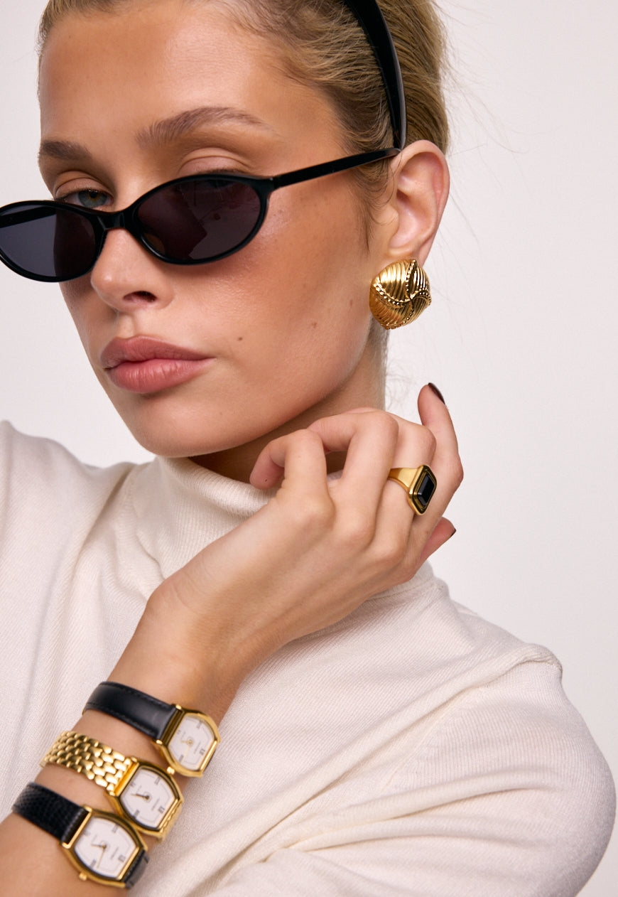 Rich, warm, and softly luminous – our signature gold finish. Each piece is plated over high-quality stainless steel for enduring wear.