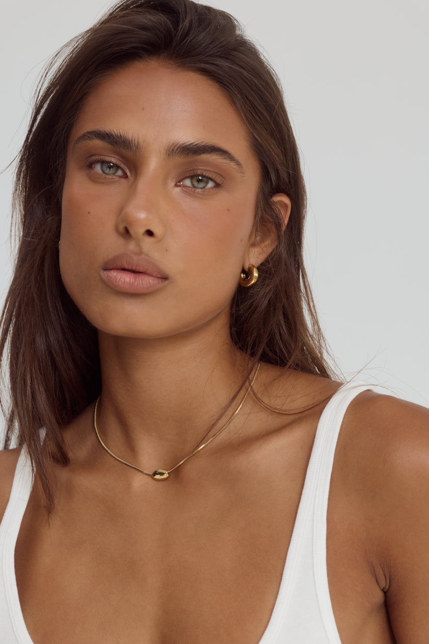 The Daphne Necklace is a rounded, minimalist pendant strung on a delicate chain. Crafted from 14k gold-plated stainless steel this dainty sculptural piece that transitions seamlessly from day to night.