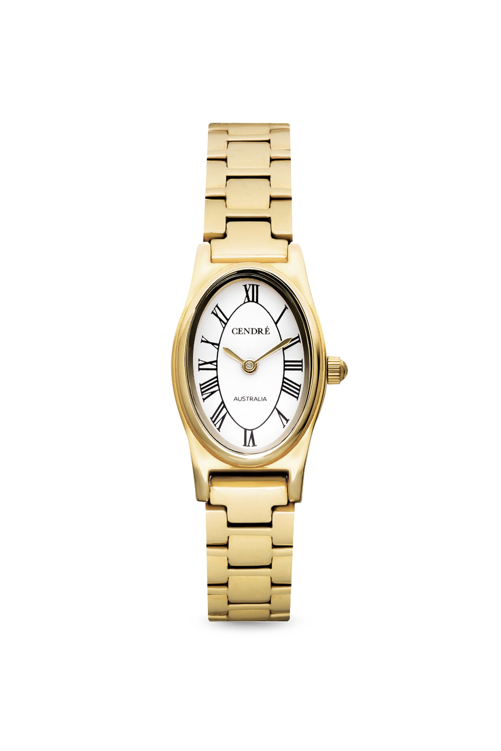 Crafted from 14k premium gold plated stainless steel, featuring a soft oval silhouette and roman numeral dial.