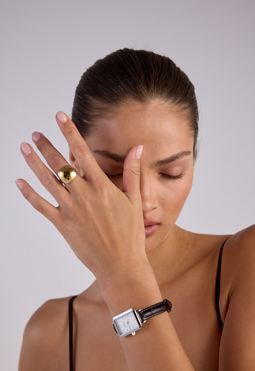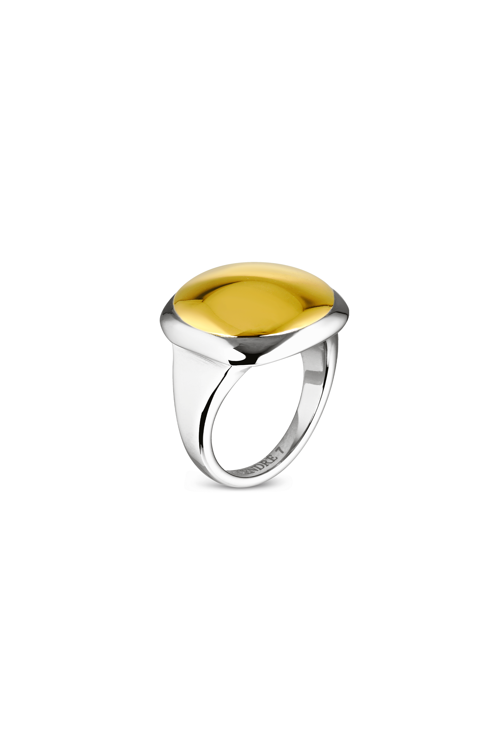 A two-tone design with sculptural balance, the Gemini Ring features a rounded gold dome set within a sculptural silver frame. Crafted from 18k gold plated stainless steel and high polish stainless steel, it pairs soft curvature with structural edge.