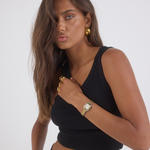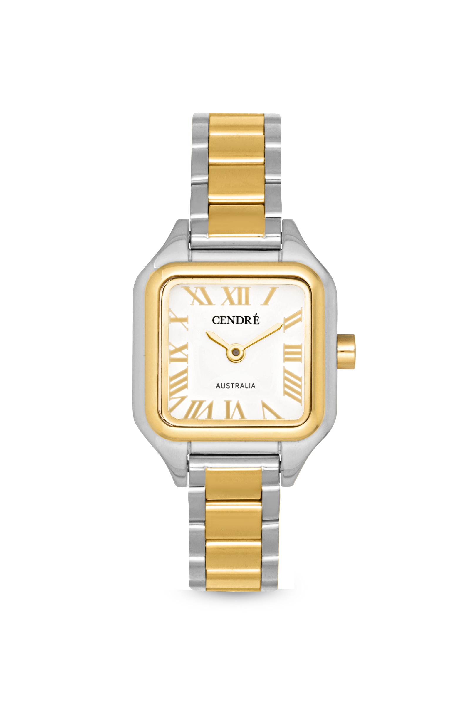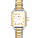 Crafted from 18k premium gold plated stainless steel and polished silver stainless steel, featuring a square face, roman numeral dial and an elegant jubilee-style band.