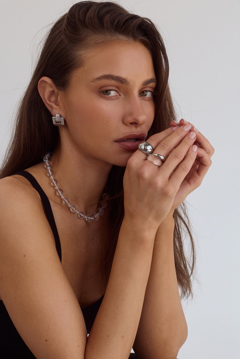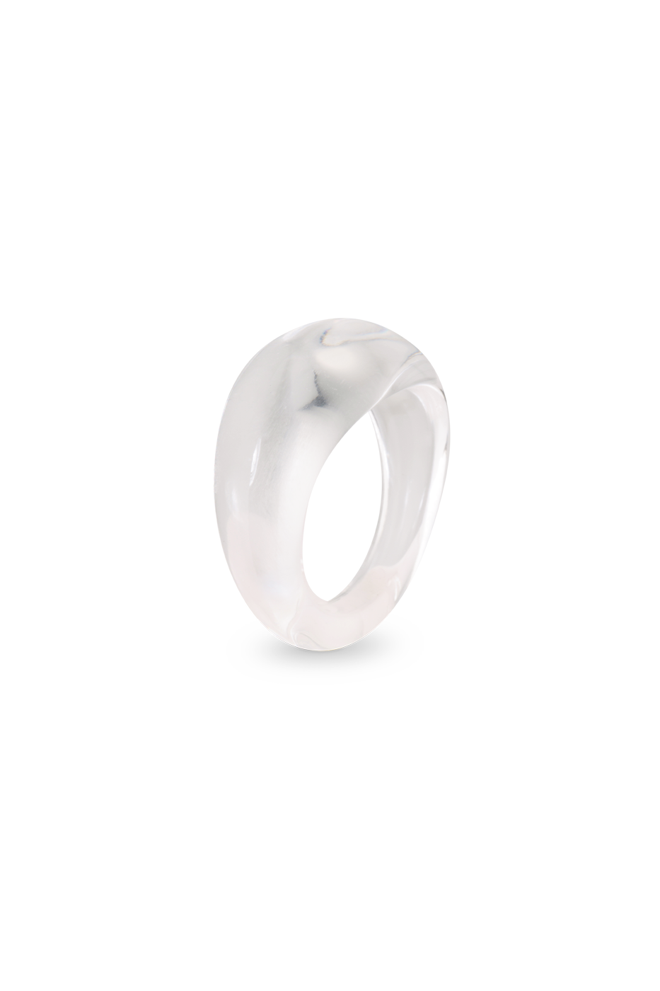 Crafted from translucent resin, its sculptural silhouette catches and reflects light with subtle dimension. Lightweight yet impactful, it brings an elevated, modern edge to everyday styling.