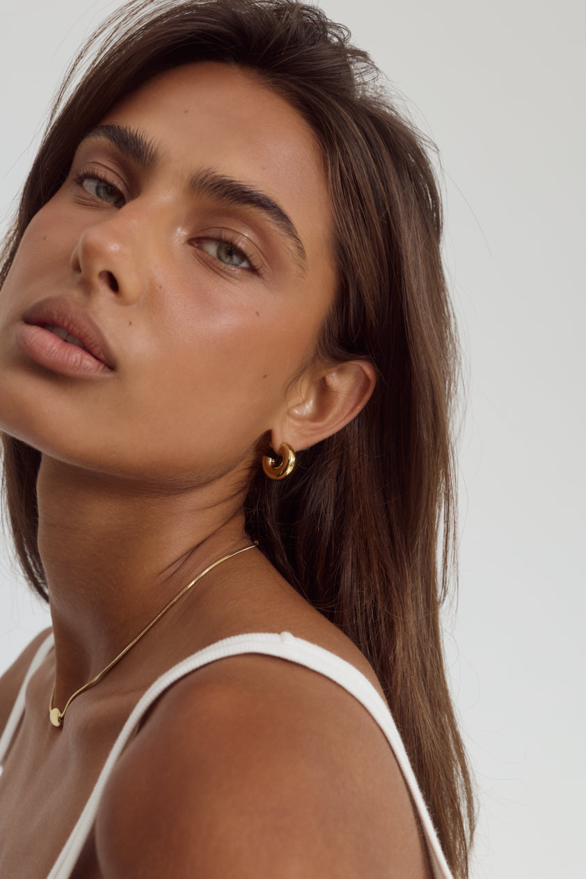 The Lola Hoops feature a softly rounded silhouette with a smooth, high-shine finish. Crafted from 14k Gold-plated stainless steel, their classic form offers an effortless, everyday staple. Wear alone or stack for a layered look.