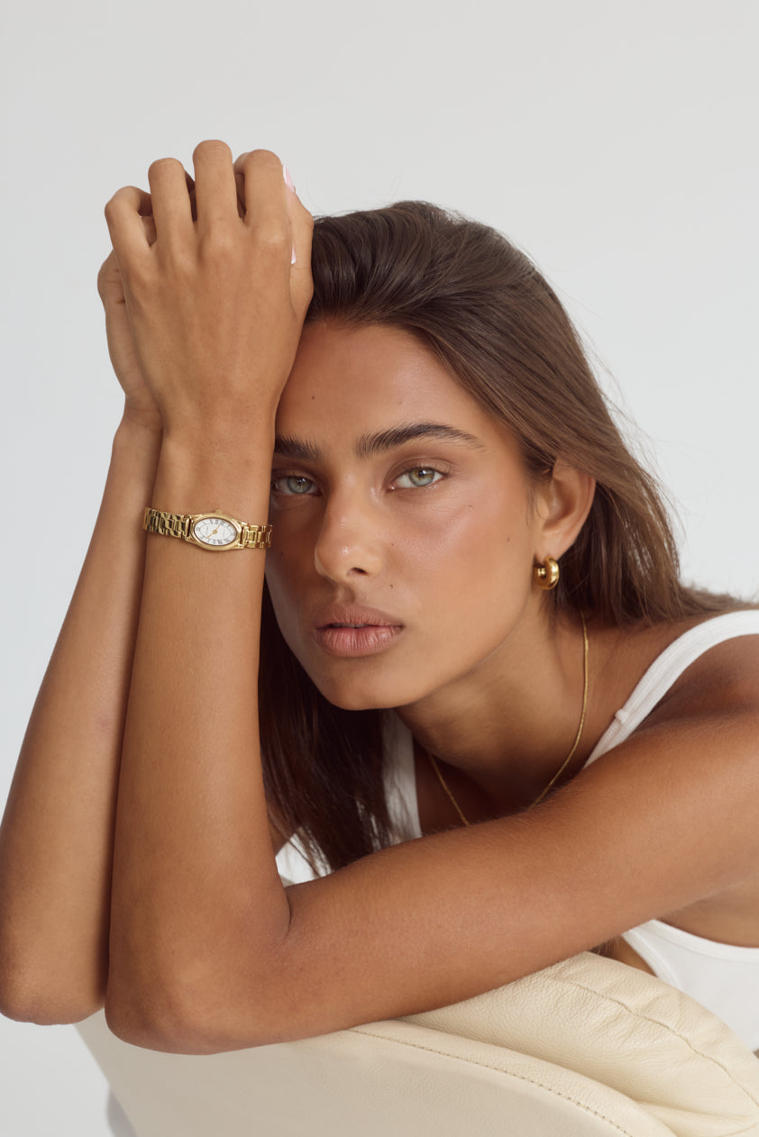 Rich, warm, and softly luminous – our signature gold finish. Each piece is plated over high-quality stainless steel for enduring wear.