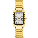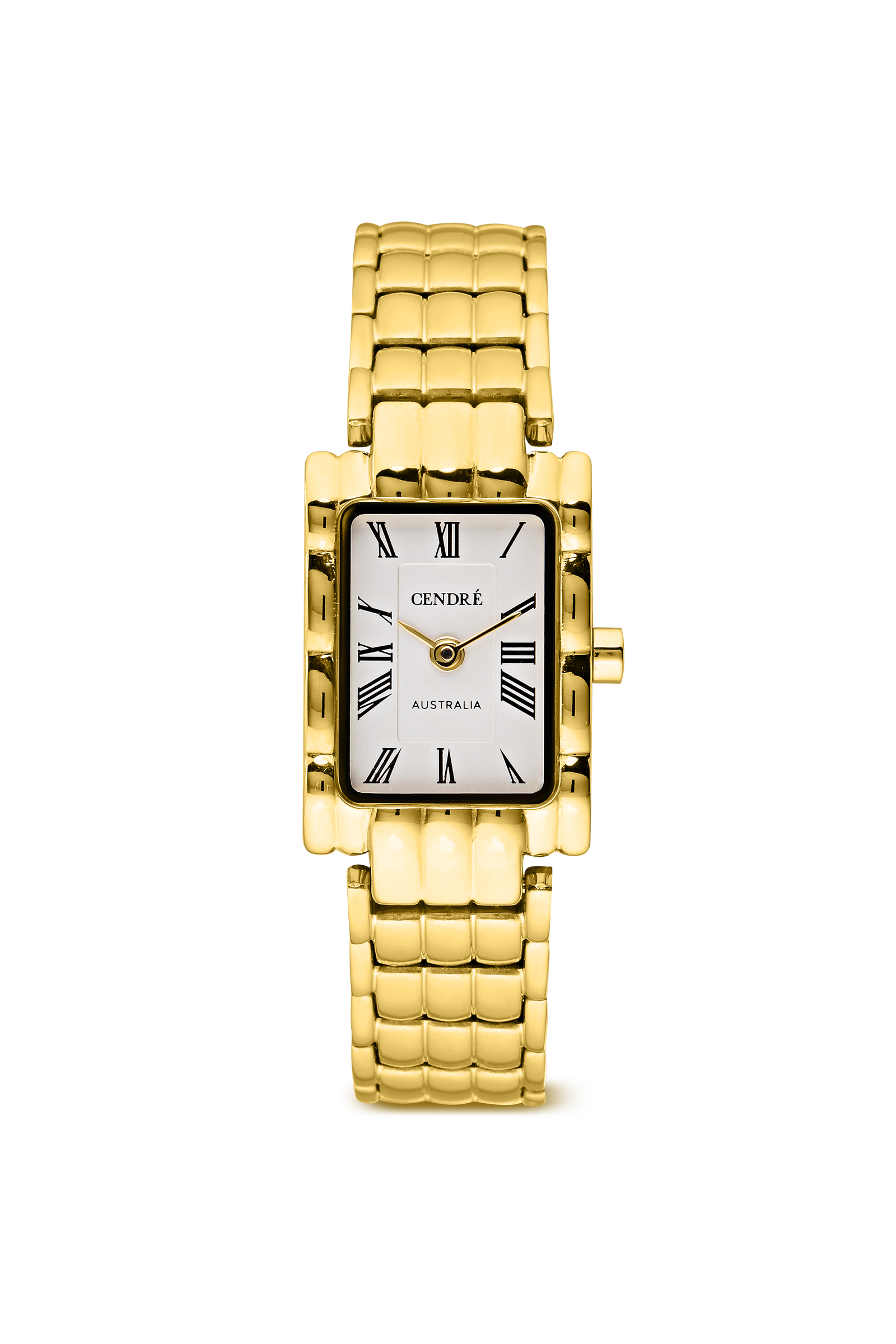 Crafted from 18k premium gold plated stainless steel, featuring a petite rectangular silhouette and roman numeral dial.