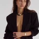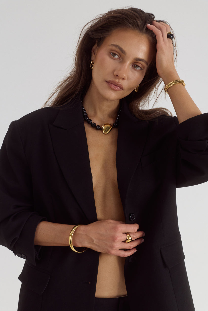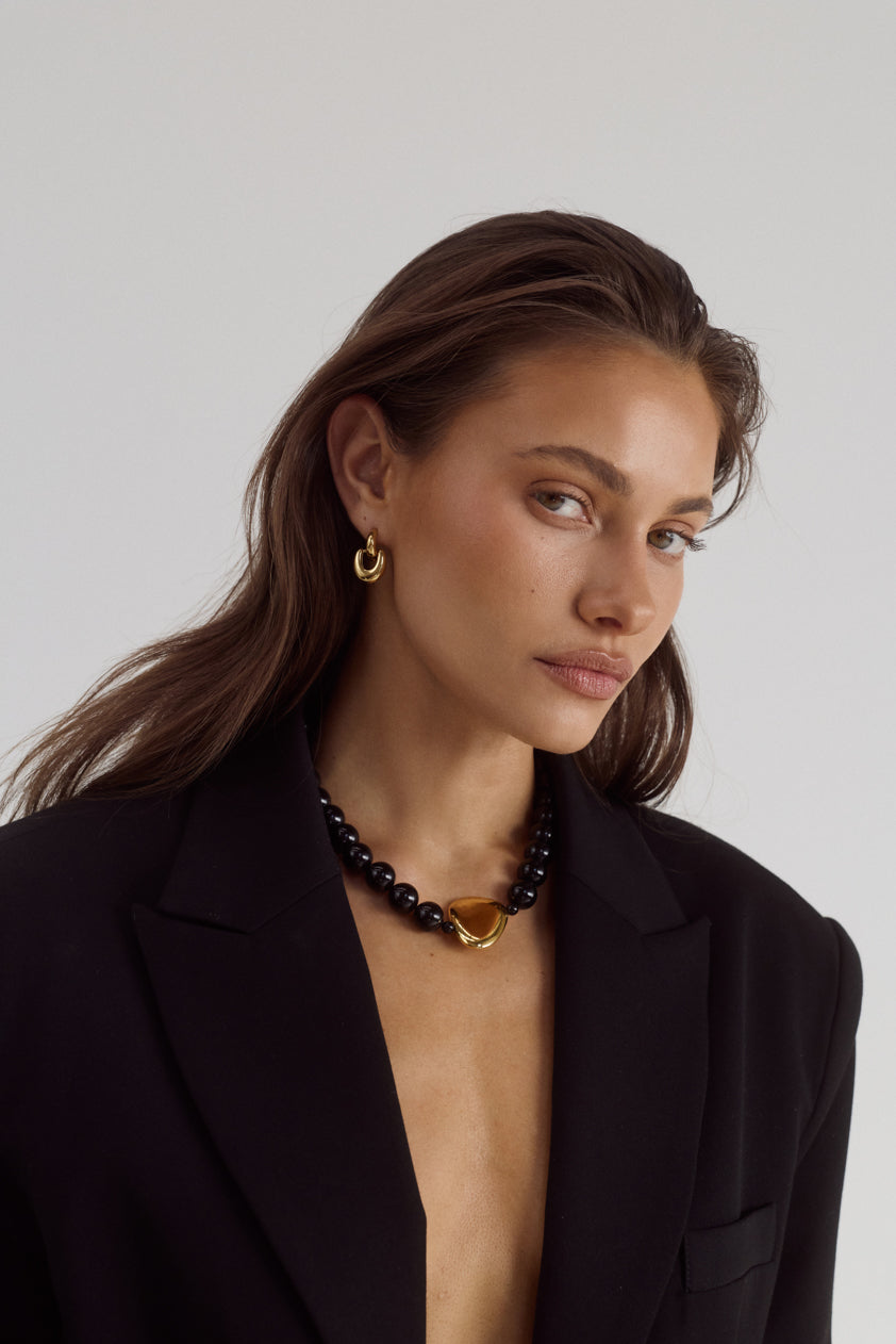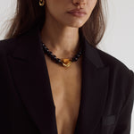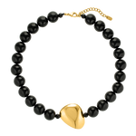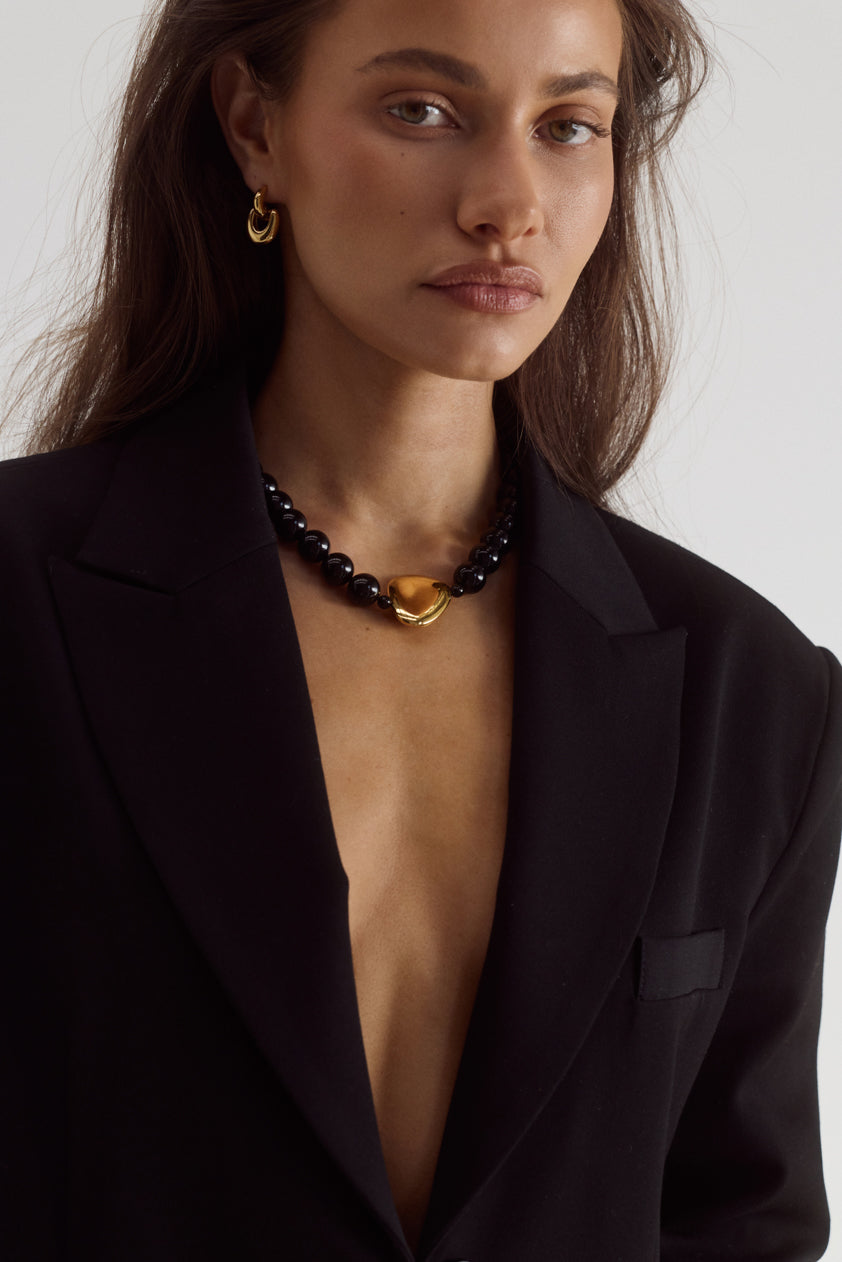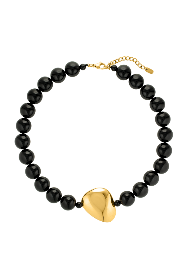 The Plaza Necklace features black resin beads centred by an organic 18k gold plated stainless steel pendant. It’s asymmetric shape and high-shine make a sculptural statement.