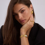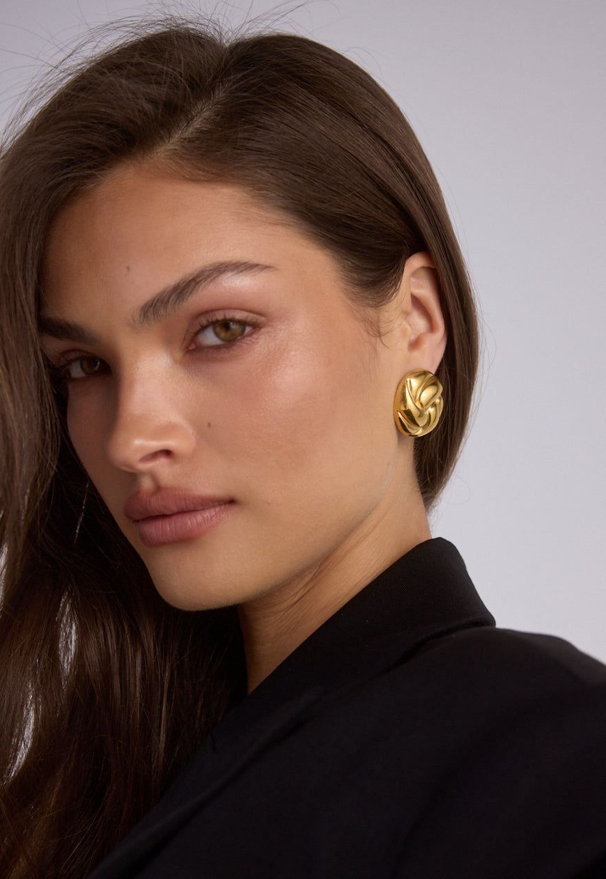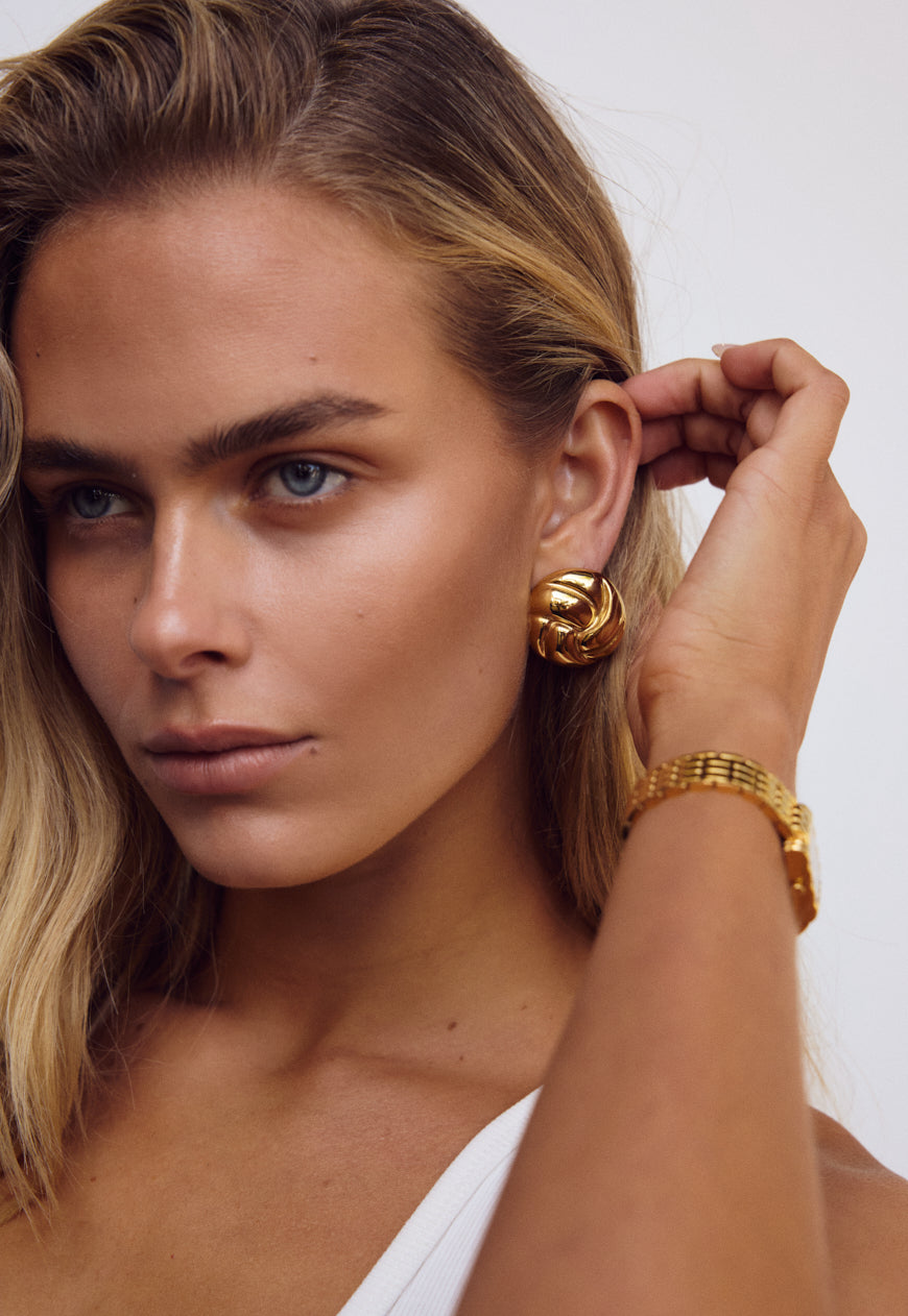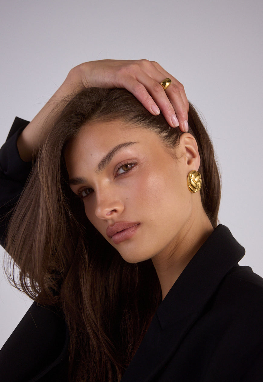 The Valerie Earring exude a vintage artistic feel with a fresh modern approach. Infused with an appearance of overlapping lines in a feminine circular shape completing a nuanced timeless design. A high shine finish brings together this statement style, expertly crafted on 18k Premium gold plated stainless steel.