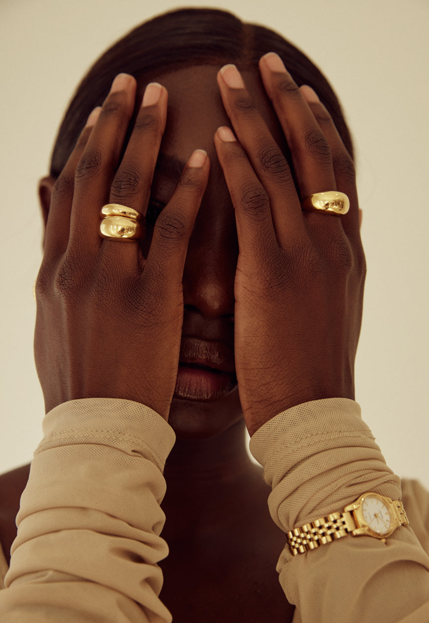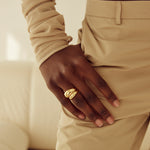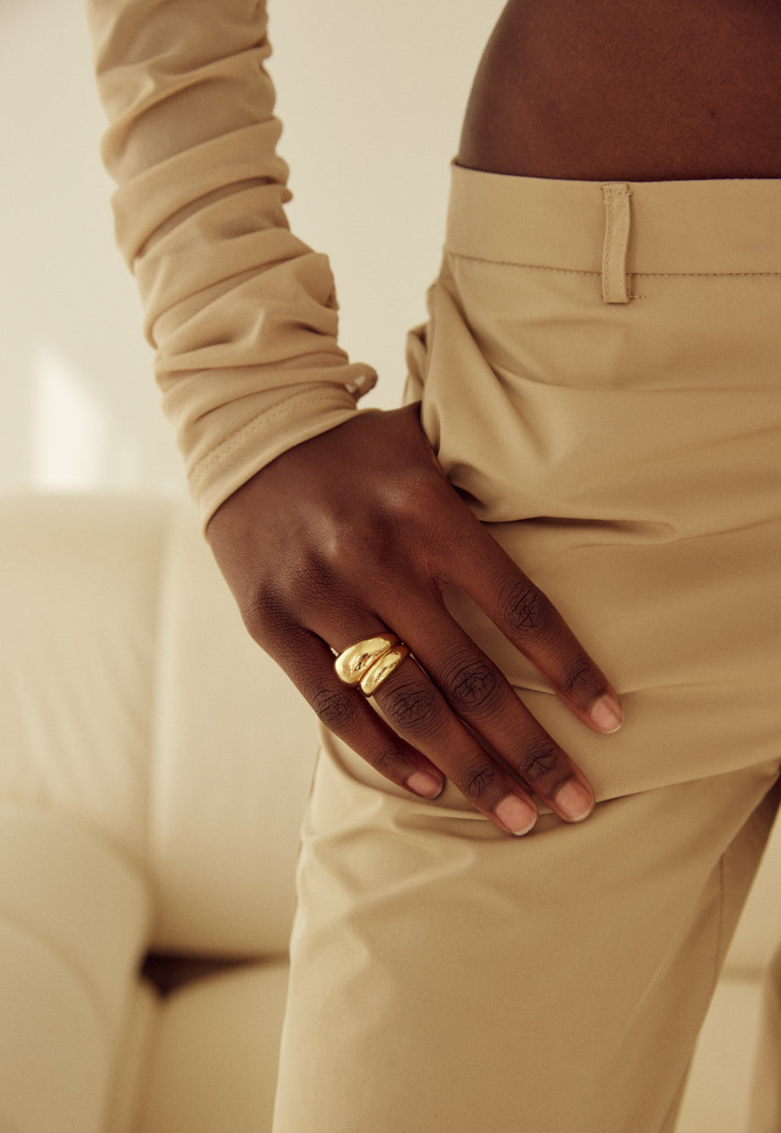 Sculptural shapes meet minimal design. Crafted in 18k gold plated on stainless steel for durability and shine, this ring is sure to become a staple in your Cendré ring rotation. It's an easy way to elevate your daily look - no matter the occasion.